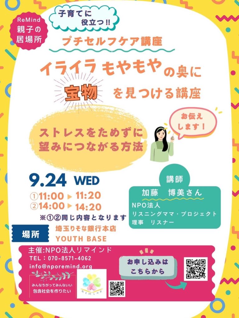 #ママのセルフケア#子育てママとつながりたい#子育て応援#イライラ解消#モヤモヤスッキリ#自分時間も大切に#ママのリフレッシュ#埼玉ママ#親子の居場所#npo法人リマインド