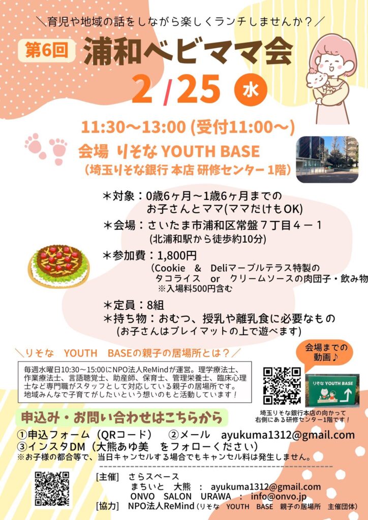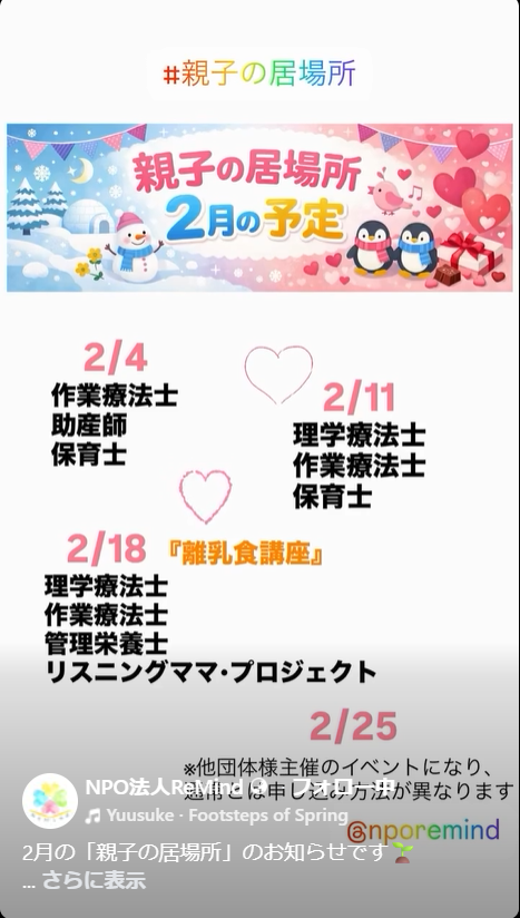2月「親子の居場所」のお知らせです お知らせ・活動予定 2026.02.21 毎週水曜日北浦和 YOUTH BASE【2月のイベント】 ・2/18(水)離乳食講座 ・2/25(水)ランチ会(他団体主催/定員あり) 普段はふらっと来られる居場所。 この日は、ちょっと特別な時間もあります気になる方はぜひお気軽につ) #親子の居場所#北浦和#子育て中のママ