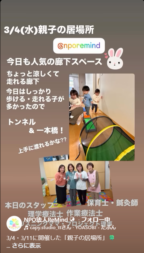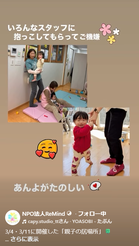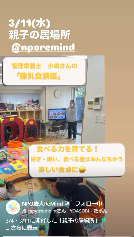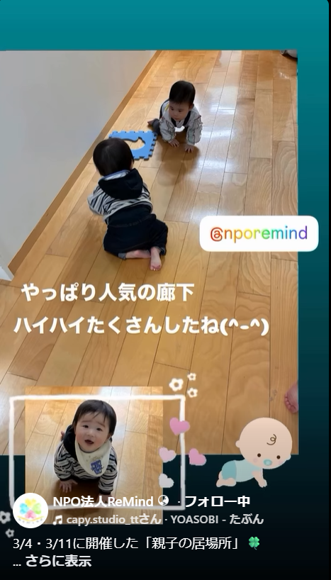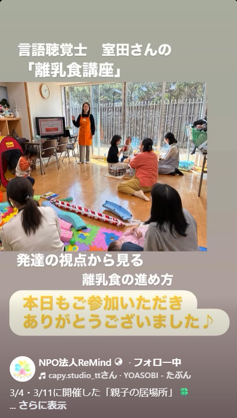 3/4・3/11開催 親子の居場所🍀 子育て支援 2026.03.21 3月前半の様子をリールにまとめました はじめて来てくれた方も、いつも来てくれる方も。 それぞれの過ごし方で、ゆるやかに繋がれる時間になりました 3/11は大好評の管理栄養士と言語聴覚士から、離乳食ミニ講座を開催しました 子どもたちの笑顔や、何気ない会話のひとときに、 私たちもたくさん元気をもらっています。 3月後半も開催予定です 「ちょっと気になる」くらいでも大歓迎 3月4日開催 3月11日開催 #親子の居場所#子育て支援#さいたま子育て