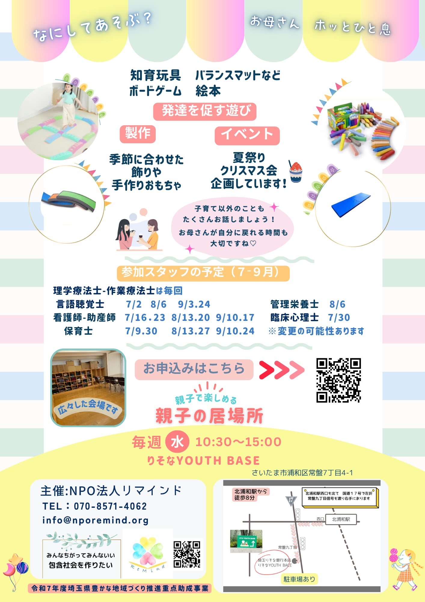 埼玉県さいたま市で、様々な医療福祉専門職と人が好きな仲間たちと共に赤ちゃんから子育て世代のみんなが居心地いい場を作っていきます。
